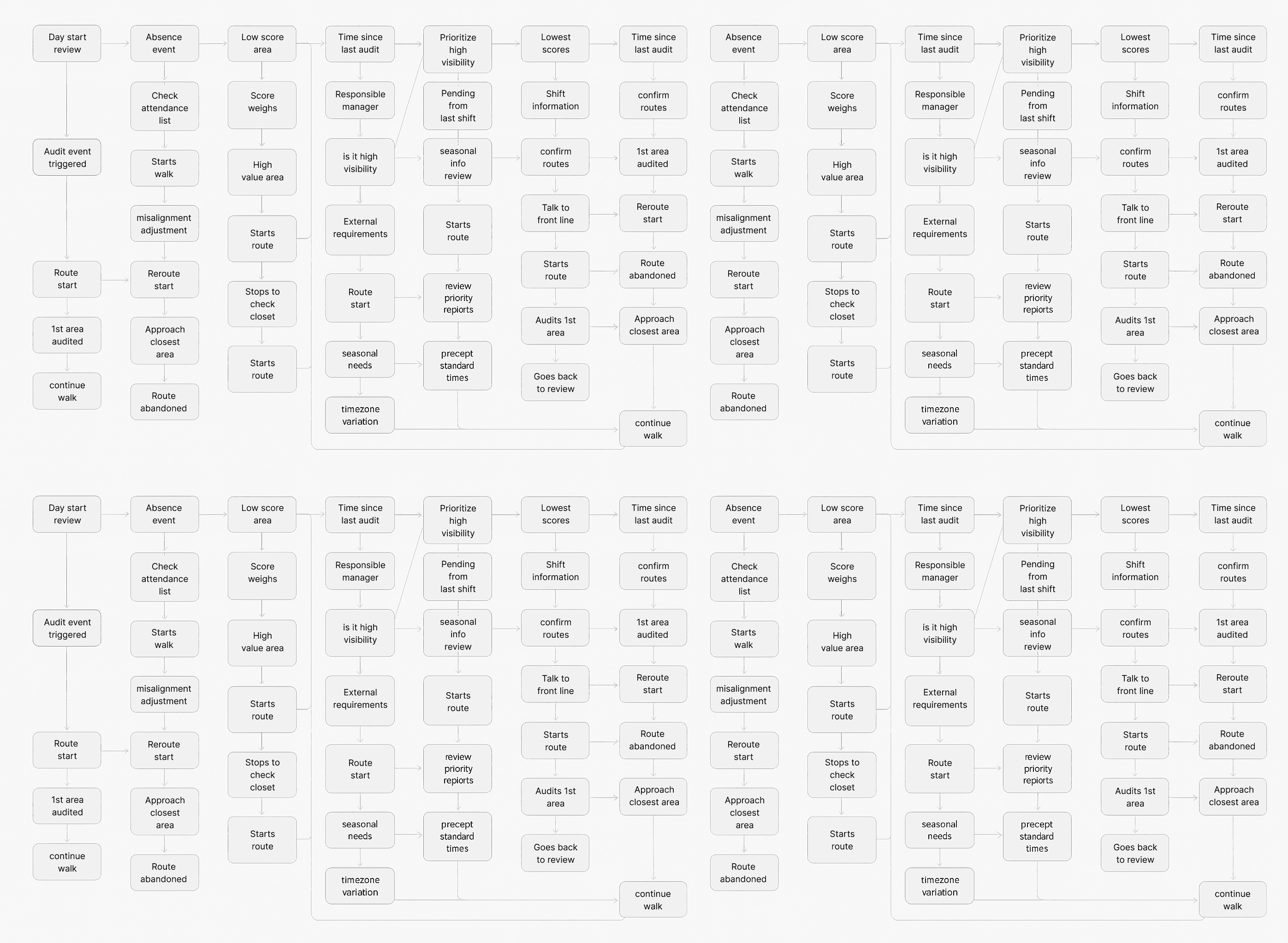 We used observed behavior — like rerouting based on complaints, location, and staff availability — as input for how the AI should prioritize audits. While they worked through the logic layer, I moved forward with addressing the remaining gaps through design: reducing planning guesswork, surfacing site coverage, and supporting the way managers actually think under pressure.