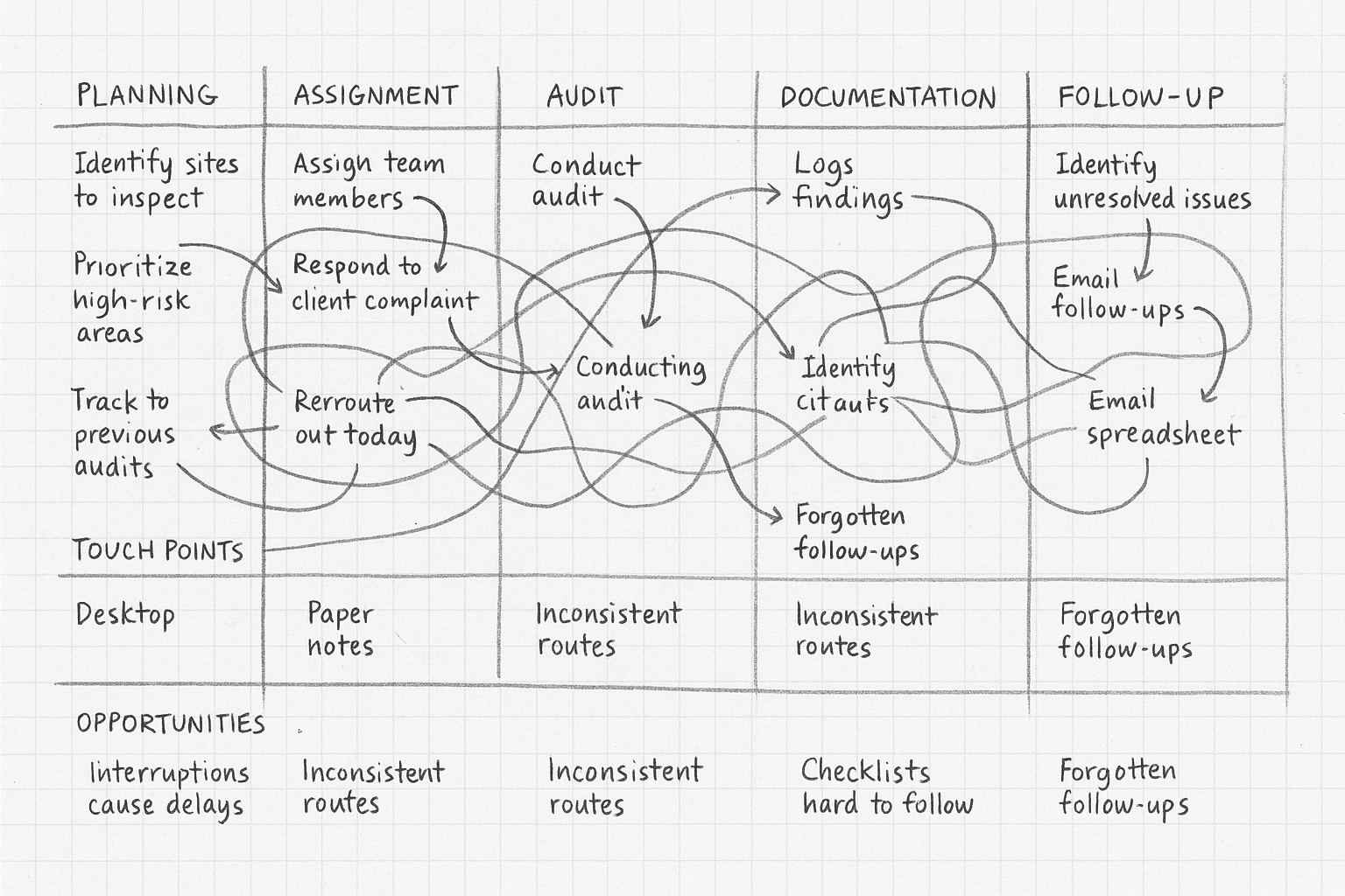 To validate the journey told in interviews, I observed managers in the field and mapped how they actually dealt with audits on site.
