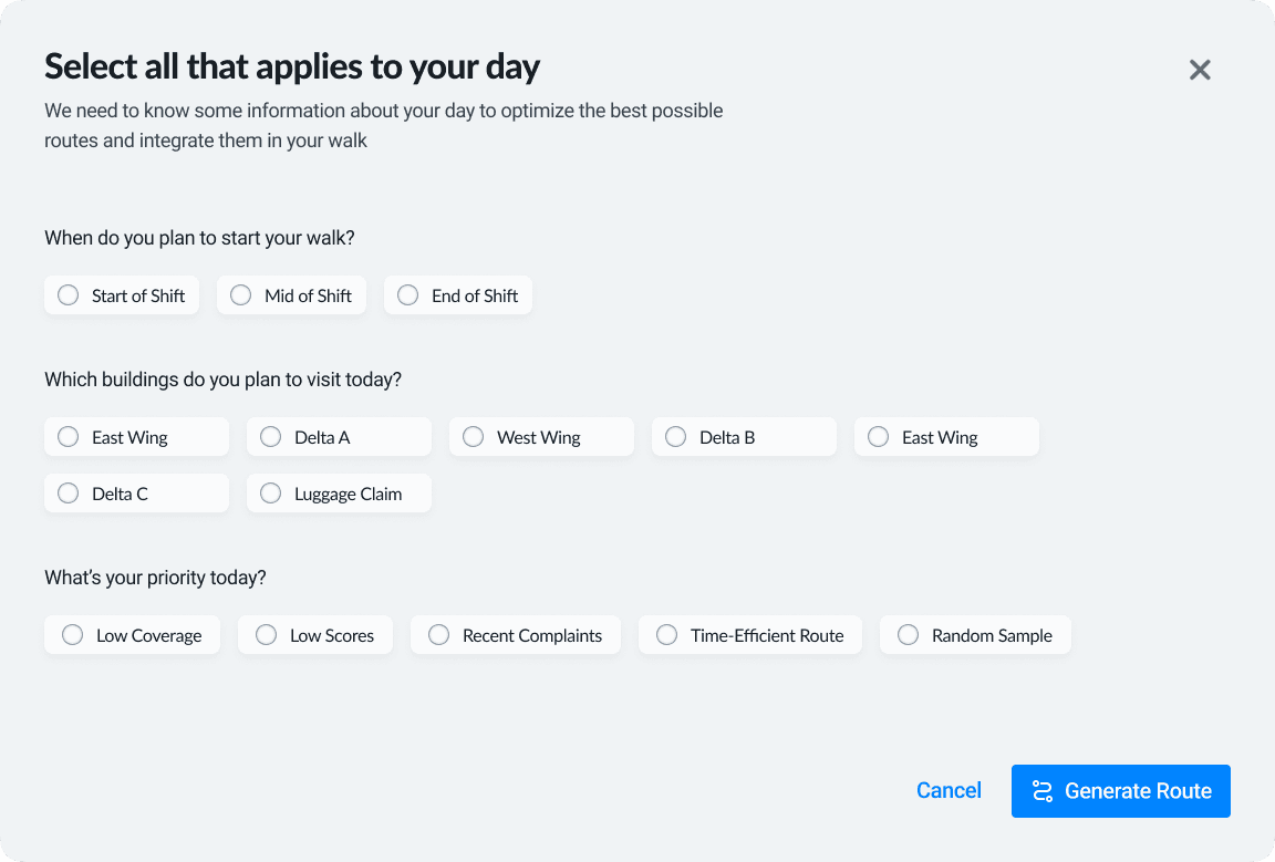 Managers didn’t want a system telling them where to go — they wanted help deciding where to start. The generator used simple prompts to guide them through key priorities like missed areas, recent failures, or high-risk zones. This not only reduced mental load, but gave managers a sense of control.
